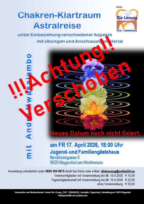 !!!ACHTUNG!!! VERSCHOBEN (neues Datum noch nicht fixiert) Chakren-Klartraum Astralreise unter Einbeziehung verschiedener Aspekte mit Übungen und Anschauungsmaterial